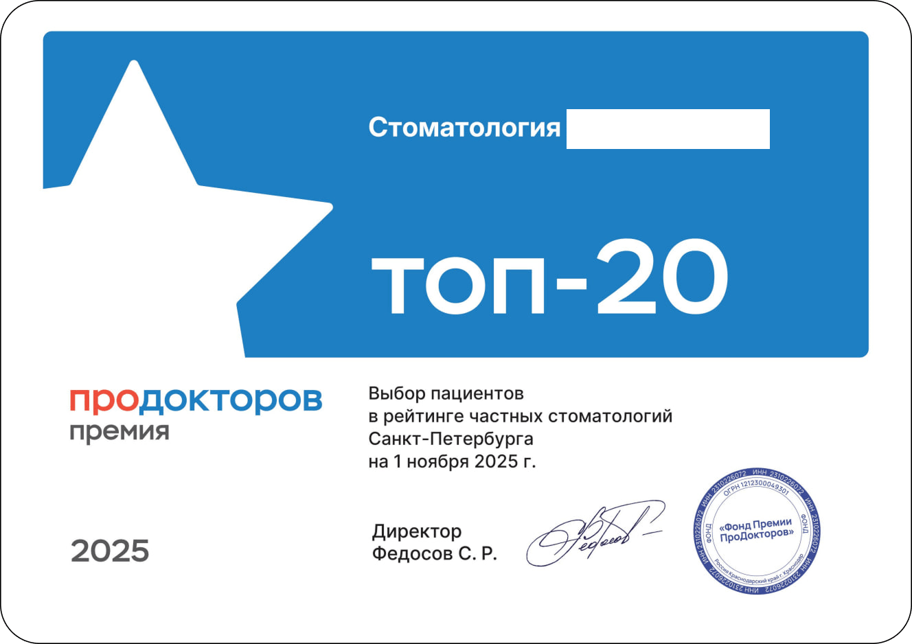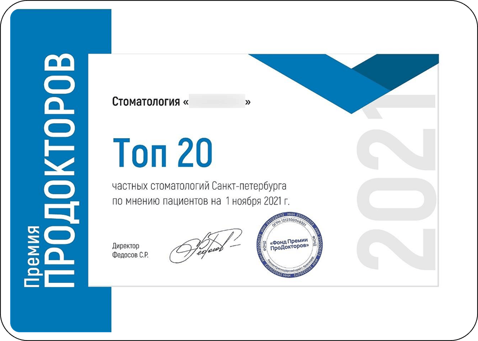 В 2025 году клиника вновь стала выбором пациентов и вошла в ТОП-20 стоматологий города.
