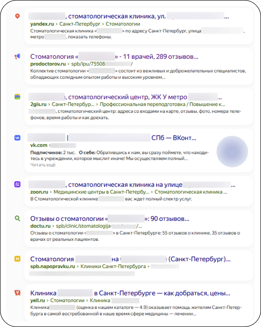 Часто клиенты ищут стоматологию рядом с домом, первые позиции важны: чем выше карточка показывается в поиске, тем выше шанс получить пациента. Мы оптимизировали карточки, добавили упоминаний для органического продвижения и с каждым месяцем наращивали рейтинг.