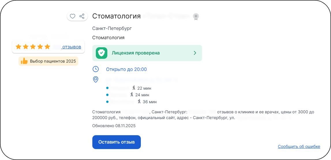 Задача — повысить видимость компании в геосервисах и на профильных медицинских площадках.