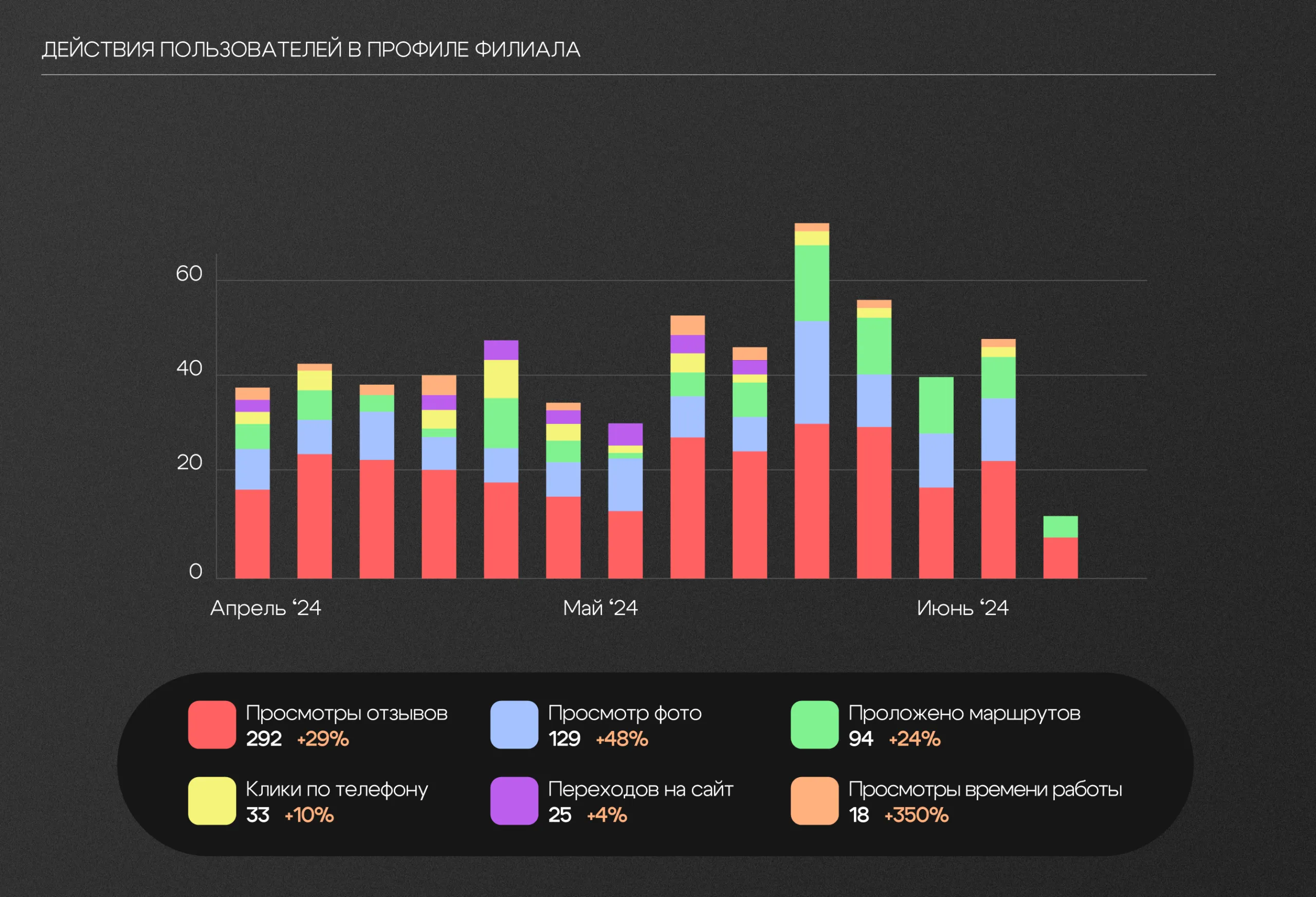 В ходе работы была настроена система тегирования по первичным и вторичным ключевым словам, создан подход к глубокой аналитике как по бренду в целом, так и по отдельным филиалам. Также были выделены приоритетные каналы коммуникации — отзовики и соцсети — и сформирован план репутационной работы.