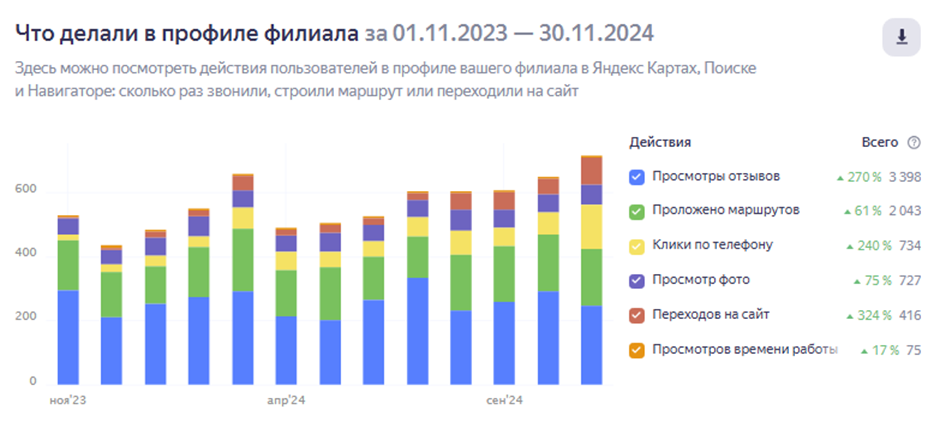 Статистика отдельного филиала — кратно вырос трафик с Яндекс Карт и количество целевых действий «позвонить».