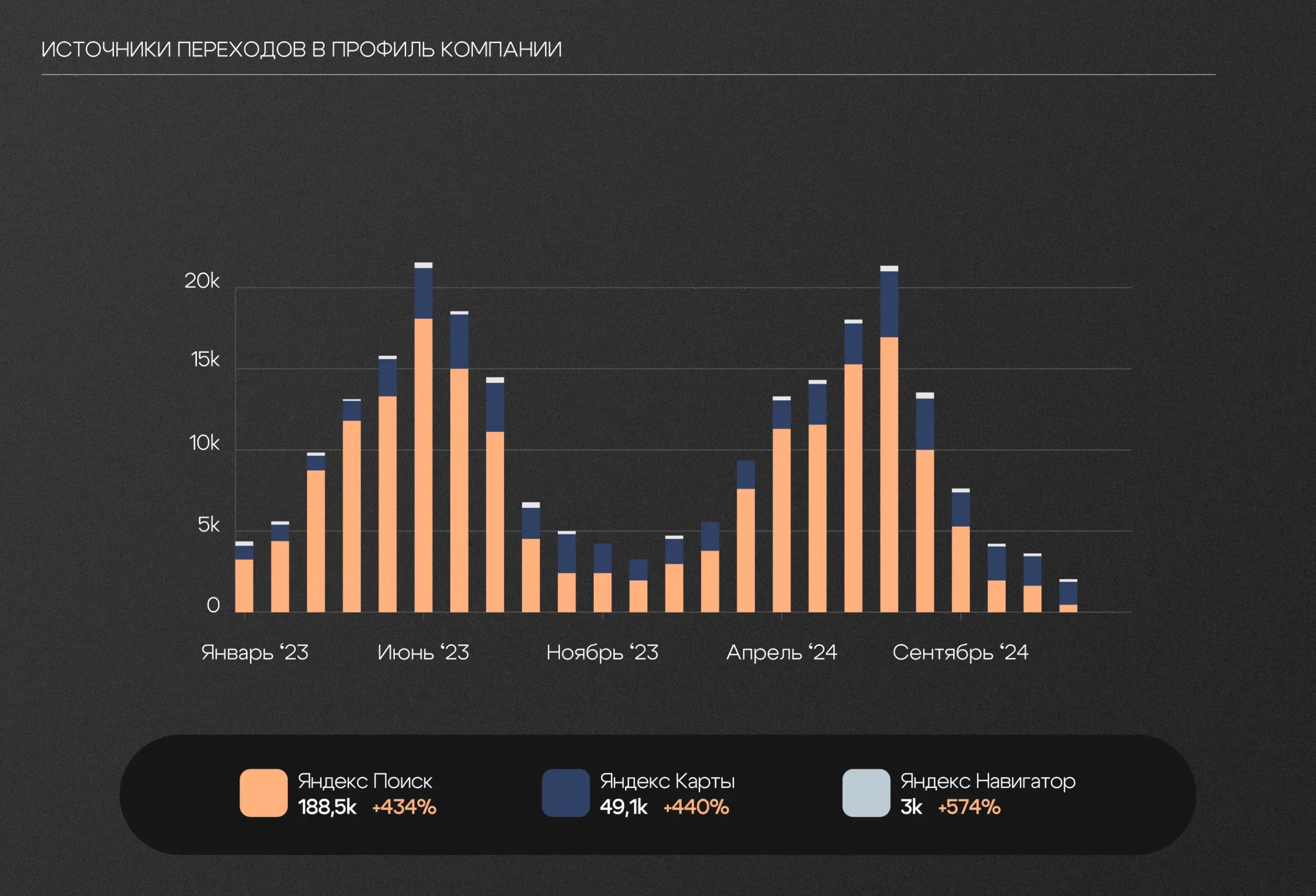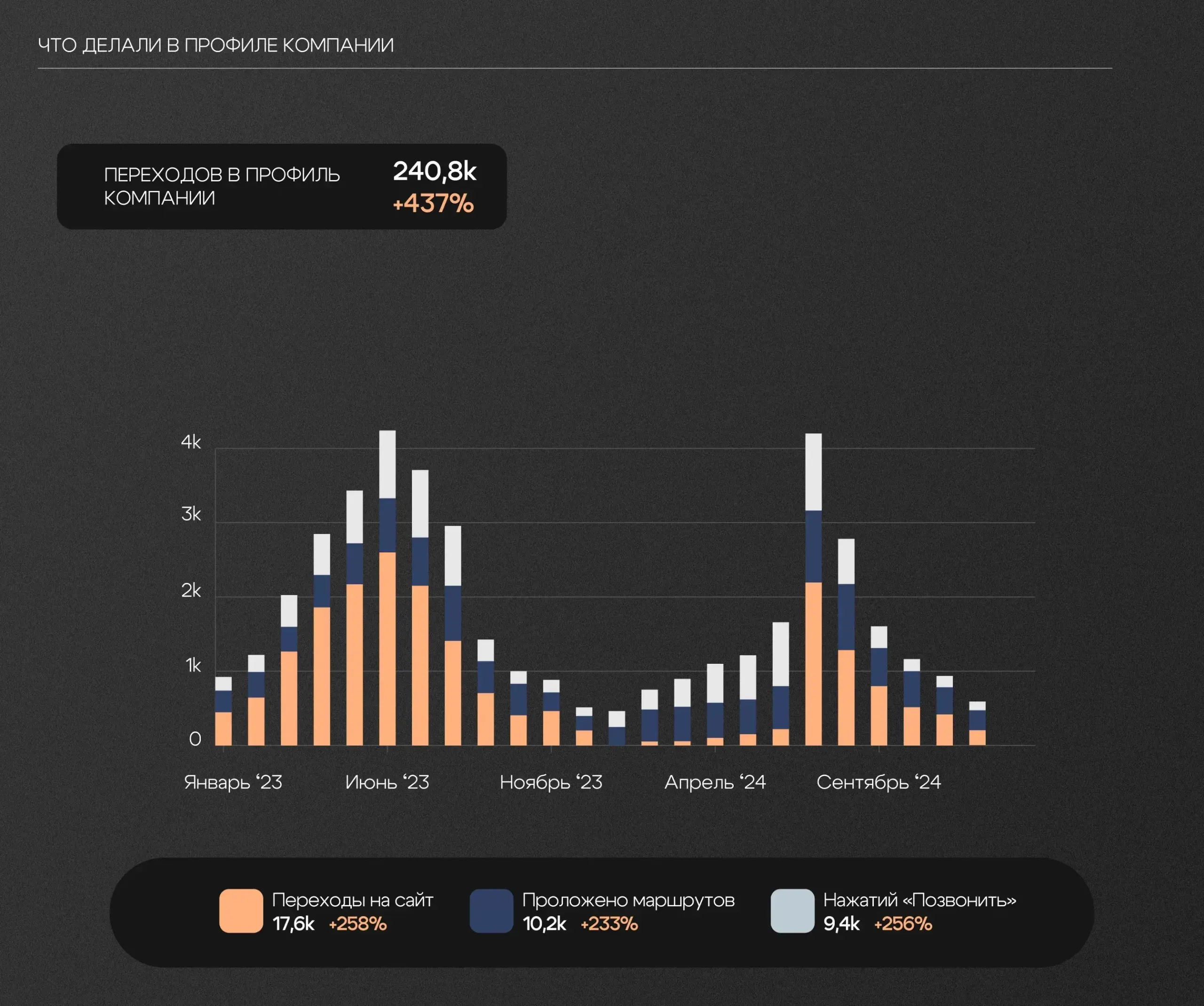 На 434% выросла видимость компании в Яндекс Картах. Количество целевых действий на 256%. График отражает изменения с учетом сезонности: пик ремонтов — весна\лето.